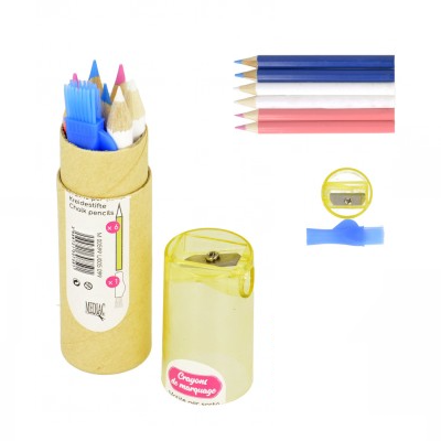 Rund burk med skräddarkritor 3 färger med pennvässare i locket.