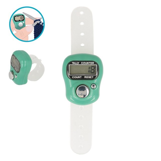 En smidig digital varvräknare som du sätter som en ring på pekfingret och manövrerar enkelt med tummen för varje varv när du stickar.