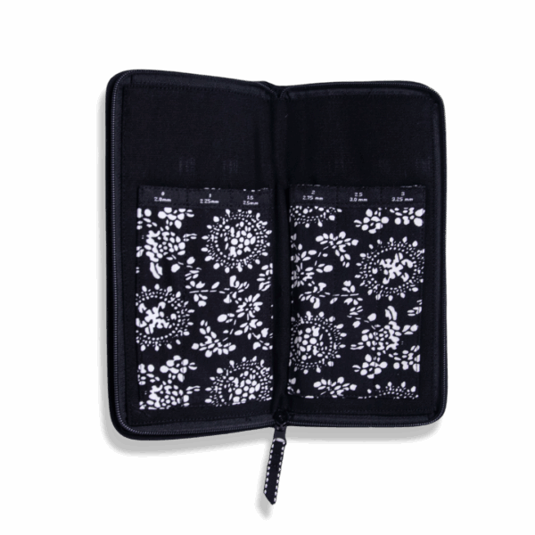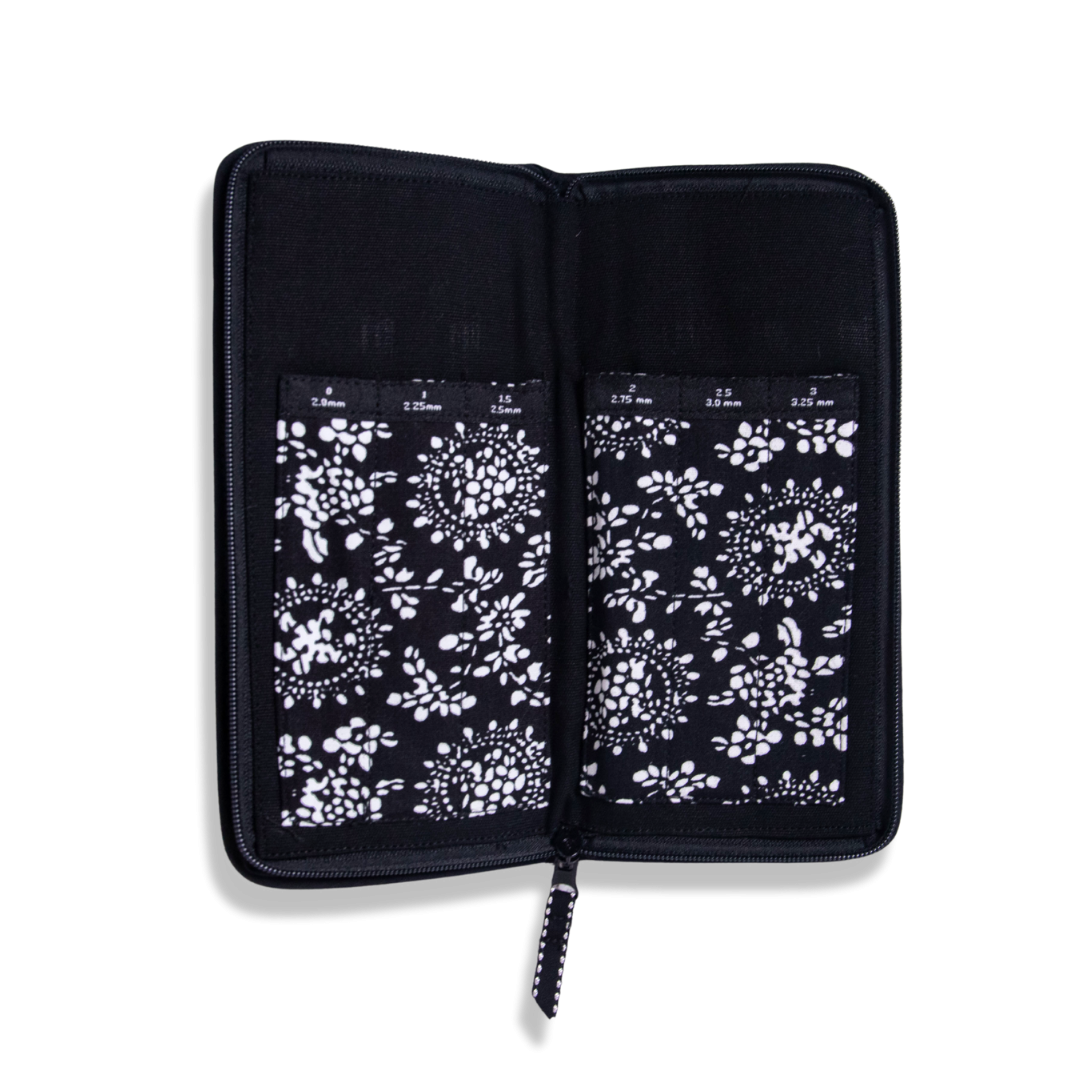 Detta praktiska fodral i bomull rymmer både virknålar och strumpstickor.