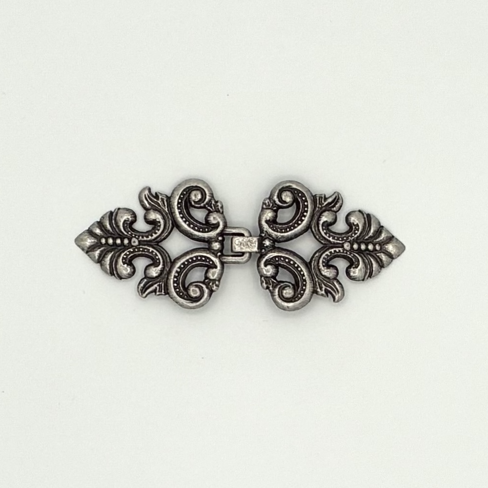 Ett spänne i metall med en vacker ornering och patina. Från Pryms knappserie Union Knopf, perfekt till koftor och kappor.